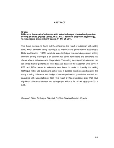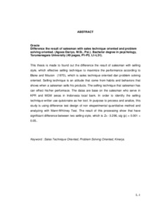 Gracia, Gracia (2011) Perbedaan Kinerja Salesman ditinjau dari Gaya Menjual Sales Technique Oriented & Problem Solving Oriented. Skripsi thesis, universitas Tarumanagara.