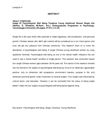 Velily, Velily (2011) Gambaran Psychological Well Being Wanita Tionghoa Dewasa Awal Hidup Melajang. Skripsi thesis, universitas Tarumanagara.