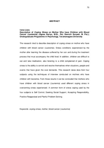 Liera, Irene (2011) Gambaran coping stress pada ibu yang memiliki anak dengan kanker darah (leukemia). Skripsi thesis, universitas Tarumanagara.