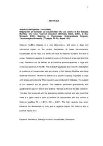 Sidoarjo mudflow disaster is a new phenomenon and gives a deep and substantial impact on the victims themselves. In these circumstances, householder as the head of a family will have the heaviest burdenin the face of stress. Resilience capacity is needed to survive in the face of stress and grief that exist. Resilience can be defined as an individual positivecapacities to cope with stress and adversity in his life. This research’s purpose is to know the description of resilience on householder who are victims of the Sidoarjo Mudflow who have received relocation. Resilience defines as a positive capacity of people to cope with stress and adversity. This research was conducted in Sidoarjo. The subject of this research are 95 person. This research performed quantitatively with questionaire based on reivich and shatte’s 7 factors as the tool for data collection. The data then analyzed with the descriptive statistic method, and was found that there is a good trend in term of resiliece on householder who are victims of Sidoarjo Mudflow (M = 3.8774; SD = 0,387). The high capacity may occur because the disasterdid not only give a negative impact, but there is also a positive impact on it.