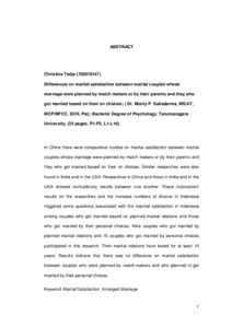 In China there were comparative studies on marital satisfaction between marital couples whose marriage were planned by match makers or by their parents and they who got married based on their on choices. Similar researches were also found in India and in the USA. Researches in China and those in India and in the USA showed contradictory results between one another. These inconsistent results on the researches and the increase numbers of divorce in Indonesia triggered some questions associated with the marrital satisfaction in Indonesia among couples who got married based on planned marital relations and those who got married by their personal choices. Nine couples who got married by planned marital relations and 16 couples who got married by personal choices participated in this research. Their marital relations have lasted for at least 10 years. Results indicate that there was no difference on marital satisfaction between couples who were planned by match-makers and who planned to get married by their personal choices.
