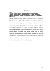 Domestic violence (“Kekerasan dalam Rumah Tangga or KDRT” in Indonesian). Violence according to Hyden (1999) defined as an act which inside it include act of kicking, hitting, threatening, effort to strangle, rape, etc. They can’t leave their husband cause they still got many consideration such as negative thinking from other people to the subject, and children, so that social support is needed to change subject view which is all this time survive in the marriage. Social support could be derived from parents, other relatives, friends, social and contact community. Data mining done by interview method, since April 2009 until June 2010. Research result shows that the subject capable to leaving the husband after years in violence, after getting social support.