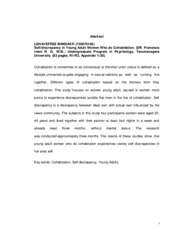 Mindiasti, Leavefree (2011) Gambaran diskrepansi diri pada wanita dewasa muda yang melakukan kohabitasi. Skripsi thesis, Universitas Tarumanagara.