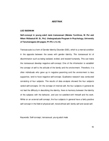 Budiman, Leo (2011) Gambaran konsep diri pada transeksual pria dewasa muda. Skripsi thesis, Universitas Tarumanagara.