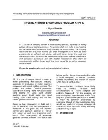 Sukania, I Wayan INVESTIGATION OF ERGONOMICS PROBLEM AT PT X. Karya Ilmiah Dosen. ISSN 1978 - 774X