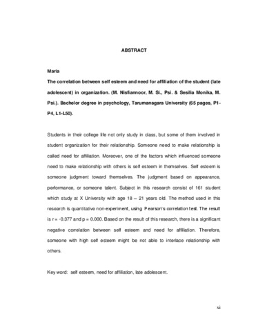 Maria, Maria (2011) Hubungan antara self-esteem dengan need for affiliation pada mahasiswa (remaja akhir) yang mengikuti organisasi. Skripsi thesis, Universitas Tarumanagara.