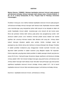 Penelitian ini bertujuan untuk melihat moderasi kepribadian ekstrovert introvert pada pengaruh self-disclosure terhadap intimacy hubungan kasih dewasa muda. Kepribadian ekstrovert adalah suatu kecenderungan yang mengarahkan pikiran lebih banyak ke luar daripada ke dalam diri sendiri. Kepribadian introvert adalah kecenderungan untuk menarik diri dari kontak sosial. Minat dan perhatian individu lebih terfokus pada pikiran dan pengalamannya sendiri. Self-disclosure adalah proses untuk membuka informasi pribadi secara disadari dan bersifat signifikan dan umumnya informasi tersebut tidak diketahui oleh orang lain. Intimacy dalam sebuah hubungan dirasakan apabila suatu perilaku individu mendapat respon dari pasangannya atau individu lainnya dan membuat ia merasa dimengerti dan dihargai. Penelitian ini adalah penelitian korelasional yang menggunakan metode kuantitatif. Instrumen yang digunakan dalam penelitian ini adalah kuesioner yang dibagikan kepada 192 responden. Kriteria responden yang digunakan dalam penelitian ini adalah pasangan kekasih yang berumur antara 20-40 tahun. Hasil perhitungan ditunjukkan dengan signifikansi self-disclosure terhadap intimacy adalah 0.000. Hal ini berarti terdapat hubungan yang positif antara self-disclosure dan intimacy dalam hubungan kasih dewasa muda. Kemudian hasil perhitungan juga menunjukkan siginifikansi kepribadian ekstrovert introvert terhadap intimacy adalah 0.671. Hal ini berarti kepribadian ekstrovert introvert tidak memoderasi pengaruh self-disclosure terhadap intimacy.