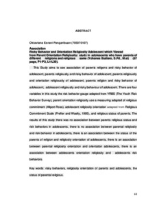 Esrani Pangribuan, Oktaviana (2012) Asosiasi perilaku berisiko dan orientasi religiusitas pada remaja ditinjau dari orientasi religiusitas orangtua remaja (Studi pada remaja yang memiliki orangtua berbeda agama dan beragama sama). Skripsi thesis, Universitas Tarumanagara.