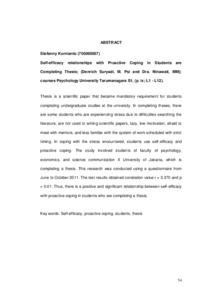 Thesis is a scientific paper that became mandatory requirement for students completing undergraduate studies at the university. In completing theses, there are some students who are experiencing stress due to difficulties searching the literature, are not used to writing scientific papers, lazy, low motivation, afraid to meet with mentors, and less familiar with the system of work scheduled with strict timing. In coping with the stress encountered, students use self-efficacy and proactive coping. The study involved students of faculty of psychology, economics, and science communication X University of Jakarta, which is completing a thesis. This research was conducted using a questionnaire from June to October 2011. The test results obtained correlation value r = 0.370 and p = 0.01. Thus, there is a positive and significant relationship between self-efficacy with proactive coping in students who are completing a thesis.