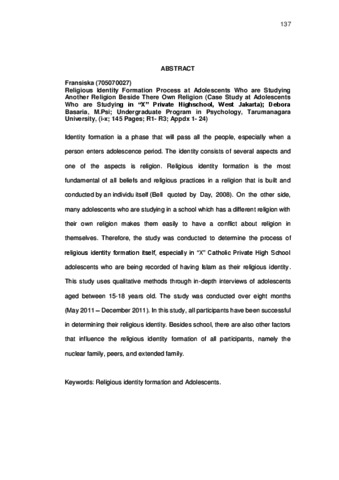 Fransiska, Fransiska (2012) Proses pembentukan identitas agama pada remaja yang mempelajari agama lain selain agama yang dianut (Studi kasus pada remaja yang bersekolah di sekolah menengah atas swasta Katolik “X”, Jakarta Barat. Skripsi thesis, Universitas Tarumanagara.