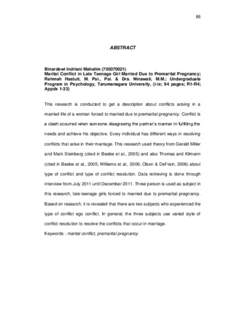 This research is conducted to get a description about conflicts arising in a married life of a woman forced to married due to premarital pregnancy. Conflict is a clash occurred when someone disagreeing the partner’s manner in fulfilling the needs and achieve his objective. Every individual has different ways in resolving conflicts that arise in their marriage. This research used theory from Gerald Miller and Mark Steinberg (cited in Beebe et al., 2005) and also Thomas and Kilmann (cited in Beebe et al., 2005; Williams et al., 2006; Olson & DeFrain, 2006) about type of conflict and type of conflict resolution. Data retrieving is done through interview from July 2011 until December 2011. Three person is used as subject in this research, late-teenage girls forced to married due to premarital pregnancy. Based on research, it is revealed that there are two subjects who experienced the type of conflict ego conflict. In general, the three subjects use varied style of conflict resolution to resolve the conflicts that occur in marriage.