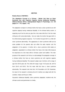 The adaptation concept of a chinese mother that have a down syndrome son with cognitive capacity having intellectual disability. In the chinese family custom, is expecting much that his wife can give him a first male child. But if the first male child grow with some abnormality, that can make the mother that gave birth to the child showing negative response. For A mother that give birth to a child with down syndrome abnormality, The appearance of down syndrome child can be some problem for the parents also can effect the early reaction and the adaptation of the parents. A mother with a down syndrome child needs an adaptation, especially for a chinese mother that have a first male child, because the importance of a first male child on chinese custom and tradition. The main purpose of this research is for find out or acknowledge The adaptation concept of a chinese mother that have an down syndrome son with cognitive capacity having intellectual disability. The research subject was 3 mothers, with a range of age from 30-50 years old. The child with range of age 14-22 years old, with IQ from 35-40 until 50-55. The first male child that have a down syndrome abnormality. The research took time from 14th November until 15th December, the result of the research is showing that all 3 mothers can adapt well with the condition, Haber and Runyon (1984).