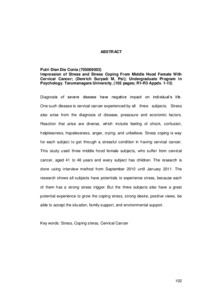 Diagnosis of severe disease have negative impact on individual’s life. One such disease is cervical cancer experienced by all three subjects. Stress also arise from the diagnosis of disease, preassure and economic factors. Reaction that arise are diverse, which include feeling of shock, confusion, helplessness, hopelessness, anger, crying, and unbelieve. Stress coping is way for each subject to get through a stressful condition in having cervical cancer. This study used three middle hood female subjects, who suffer from cervical cancer, aged 41 to 48 years and every subject has children. The research is done using interview method from September 2010 until January 2011. The research shows all subjects have potentials to experience stress, because each of them has a strong stress trigger. But the three subjects also have a great potential experience to grow the coping stress, strong desire, positive views, be able to accept the situation, family support, and environmental support.