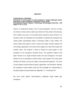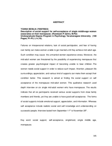 Failures on interpersonal relations, lack of social participation, and fear of having own family can make women unable to get married until they achieve mid-adult age. Such condition may cause the unmarried women experience stress. Moreover, the mid-adult women are threatened by the possibility of experiencing menopause that creates greater psychological impact of becoming unable to bear children. The women needs social support in order to reduce such impact. Attention, pleasant life surroundings, appreciation, and various kind of supports can make them accept their condition better. This research is aimed at finding the social support on self acceptance of the menopause mid-adult women. This qualitative research used depth interview on six single mid-adult women who have menopause. The results indicate that all six participants received various social supports from close family members and friends, yet they are unable to have good self acceptance. The forms of social supports include emotional support, appreciation, and information. Whereas self acceptance include realistic social and self knowledge and understanding on successful people. Interview lasted from September 11th to November 29th.