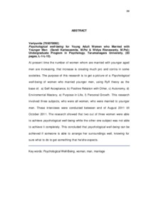 At present time the number of women whom are married with younger aged men are increasing, that increase is creating much pro and contra in some societies. The purpose of this research is to get a picture of a Psychological well-being of women who married younger men, using Ryff theory as the base of; a) Self Acceptance, b) Positive Relation with Other, c) Autonomy, d) Enviromental Mastery, e) Purpose in Life, f) Personal Growth. This research involved three subjects, who were all women, who were married to younger men. These interviews were conducted between end of August 2011 till October 2011. The research showed that two out of three women were able to achieve psychological well-being while the other one subject was not able to achieve it completely. This concluded that psychological well-being can be achieved if someone is able to arrange her surroundings well, knowing for sure what to do to get something that he/she expects.