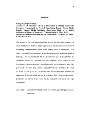 Regina, Lani (2012) Asosiasi rute pemikiran persuasi elaboration likelihood model dengan keterlibatan konsumen pada iklan produk kecantikan “Ponds White Beauty” melalui media televise. Skripsi thesis, Universitas Tarumanagara.