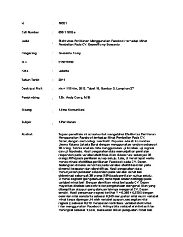 Tomy, Soesanto (2011) Efektivitas Periklanan Menggunakan Facebook terhadap Minat Pembelian Pada CV. Dezen/Tomy Soesanto. Skripsi thesis, UNIVERSITAS TARUMANAGARA.