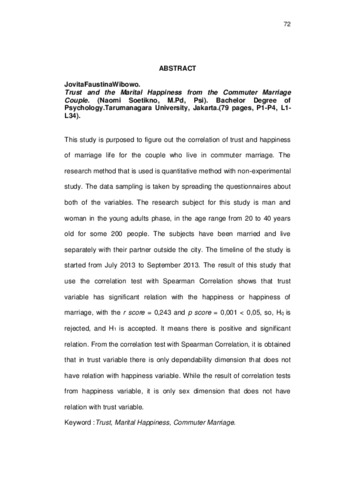 Faustina, Jovita (2013) Trust Dan Marital Happiness Pada Pasangan Commuter Marriage. Skripsi thesis, Universitas Tarumanagara.