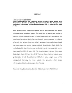 Catarina, Alethea (2013) Gambaran Body Dissatisfaction Dan Upaya Penanggulangannya Pada Wanita Dewasa Awal Yang Mengalami Obesitas Genetik. Skripsi thesis, Universitas Tarumanagara.