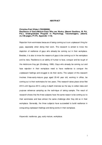 Rejection from workmates because of being coming out is an unpleasant thing for gays, especially when doing their work. The research is aimed to know the depiction of resilience of gays who already be coming out in their workplace. Besides, it is also to know the reasons of gays to be coming out in the workplace and its risks. Resilience is an ability of human to face, conquer and be tough of the misfortune they get (Grotberg, 1999). Gays who already be coming out and face rejection in their workplace need to have resilience to conquer the unpleasant feelings and struggle to do their works. The subject of this research involves three-early-mature gays aged 25-40 year old, working in office, be coming out to their workmates for two years. This research takes place since Mei 2013 until Agustus 2013, using in-depth interview as the way to collect data and purpose reference sampling as the technique of taking sample. The result of research shows that the three subjects have the same reason to be coming out to their workmates and face almost the same challenge after they did so in their workplace. Generally, the three subjects have succeeded to build resilience in conquering unpleasant feelings and doing works in their workplace.