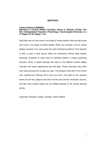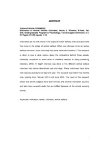 Volunteers are not only move in the scope of human welfare, there are also some that move in the scope of animal welfare. When one chooses to be an animal welfare volunteer, he or she surely has some motivations behind it. This research is done to give a clear picture about the motivations behind those people. Generally, motivation is some drive or individual reasons in doing something (Deckers, 2010). In depth interview was done to five different animal welfare volunteer that rescue abandoned cats and dogs. These volunteers have done their rescuing activity for at least one year. This research was held in five months time, starting from February 2013 until June 2013. The result of this research shows that all five subjects have both intrinsic and extrinsic motivation sources, and also have several needs that are fulfilled because of the animal rescuing activity.