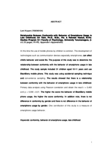 At this time the use of mobile phones by children is common. The development of technologies such as communication devices especially smartphones, can affect child's behavior and social life. The purpose of this study was to determine the relationship between conformity with the behavior of smartphone usage in late childhood. The study sample included 31 children aged 10-11 years and use BlackBerry mobile phone. This study was using accidental sampling technique and convenience sampling. The results showed that there is a relationship between conformity with the behavior of smartphone usage in late childhood. Primary data analysis using Pearson correlation and obtain the result r = 0,483 and p = 0,006 <0,01. The higher the score the behavior of BlackBerry mobile phone usage, the higher the score conformity. In addition note, there is not difference in conformity by gender and there is not difference in the behavior of smartphone usage by gender. One contribution of this study is a measure of smartphone usage behavior.