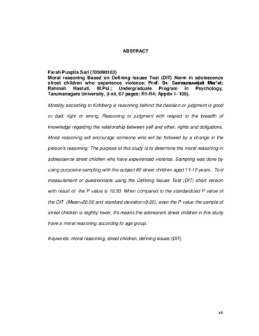 Sari, Farah Puspita (2013) Penalaran Moral Berdasarkan Norma Defining Issues Test (DIT) Pada Anak Jalanan Usia Remaja Yang Mengalami Kekerasan. Skripsi thesis, Universitas Tarumanagara.