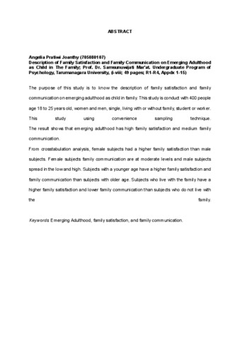 "The purpose of this study is to know the description of family satisfaction and family communication on emerging adulthood as child in family. This study is conduct with 400 people age 18 to 25 years old, women and men, single, living with or without family, student or worker. This study using convenience sampling technique.