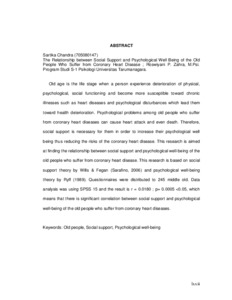 Old age is the life stage when a person experience deterioration of physical, psychological, social functioning and become more susceptible toward chronic illnesses such as heart diseases and psychological disturbances which lead them toward health deterioration. Psychological problems among old people who suffer from coronary heart diseases can cause heart attack and even death. Therefore, social support is necessary for them in order to increase their psychological well being thus reducing the risks of the coronary heart disease. This research is aimed at finding the relationship between social support and psychological well-being of the old people who suffer from coronary heart disease. This research is based on social support theory by Wills & Fegan (Sarafino, 2006) and psychological well-being theory by Ryff (1989). Questionnaires were distributed to 245 middle old. Data analysis was using SPSS 15 and the result is r = 0.0180 ; p= 0.0005 <0.05, which means that there is significant correlation between social support and psychological well-being of the old people who suffer from coronary heart diseases.