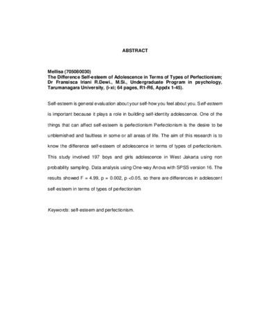 Mellisa, Mellisa (2012) Perbedaan self esteem remaja ditinjau dari tipe perfeksionisme. Skripsi thesis, Universitas Tarumanagara.