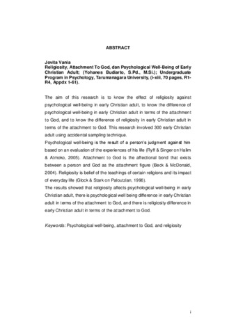 Vania, Jovita (2012) Religiusitas, kelekatan pada Tuhan (attachment to God) dan kesejahteraan psikologis pada individu Kristen dewasa awal. Skripsi thesis, Universitas Tarumanagara.