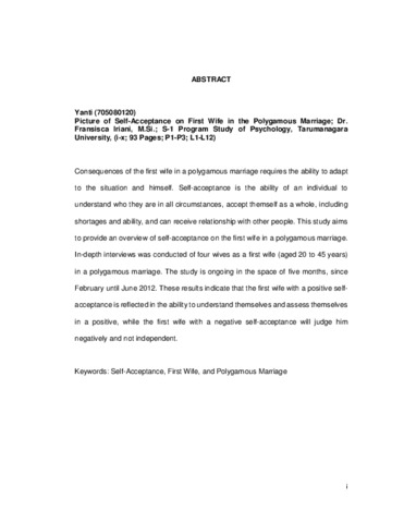 Consequences of the first wife in a polygamous marriage requires the ability to adapt to the situation and himself. Self-acceptance is the ability of an individual to understand who they are in all circumstances, accept themself as a whole, including shortages and ability, and can receive relationship with other people. This study aims to provide an overview of self-acceptance on the first wife in a polygamous marriage. In-depth interviews was conducted of four wives as a first wife (aged 20 to 45 years) in a polygamous marriage. The study is ongoing in the space of five months, since February until June 2012. These results indicate that the first wife with a positive self-acceptance is reflected in the ability to understand themselves and assess themselves in a positive, while the first wife with a negative self-acceptance will judge him negatively and not independent.