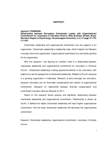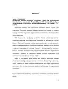 With this research, I am figuring out whether there is a relationship between charismatic leadership and organizational commitment for volunteers in Christian Church. Charismatic leadership is being questioned directly to the volunteers, with objective to see the perspective of charismatic leadership. Related to Church, because is a growing organization in Indonesia. Research is done amongst the volunteers, because volunteers are not financially compensated with relation to organizational commitment. Research on relationship between financial compensation and commitment has been done by Maramis on 2011.