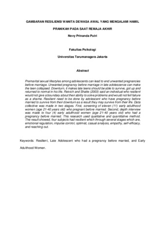 Prinanda Putri, Nevy (2012) Gambaran Resiliensi Wanita Dewasa Awal yang Mengalami Hamil Pranikah pada saat Remaja Akhir. Skripsi thesis, Universitas Tarumanagara.