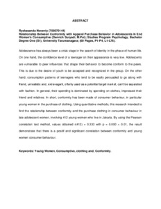 Noventy, Ryzkasanda (2012) Hubungan Antara Konformitas dengan Perilaku Pembelian Pakaian Secara Konsumtif Pada Remaja Akhir Wanita. Skripsi thesis, Universitas Tarumanagara.