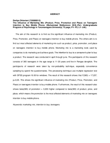 Oktaviani, Dwitya (2012) Pengaruh marketing mix (product, price, place, and promotion) terhadap intensi membeli handphone pada remaja. Skripsi thesis, Universitas Tarumanagara.