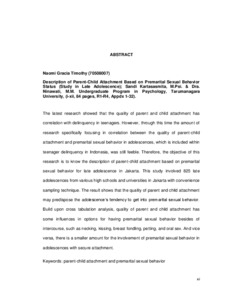 Gracia Timothy, Naomi (2012) Gambaran attachment orangtua-anak berdasarkan status premarital sexual behavior (studi pada remaja akhir). Skripsi thesis, Universitas Tarumanagara.