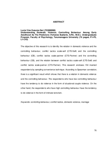 Vina Kusuma Sari, Lucia (2012) Memahami kekerasan dalam rumah tangga (KDRT) pada perkawinan dewasa awal ditinjau dari controlling behavior pasutri. Skripsi thesis, Universitas Tarumanagara.