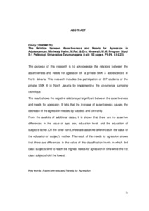 "The purpose of this research is to acknowledge the relations between the assertiveness and needs for agression of a private SMK X adolescences in North Jakarta. This research includes the participation of 357 students of the private SMK X in North Jakarta by implementing the convinence sampling technique.