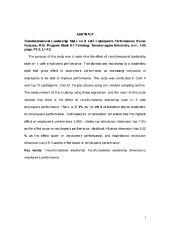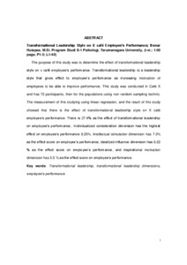 The purpose of this study was to determine the effect of transformational leadership style on x café employee’s performance. Transformational leadership is a leadership style that gives effect to employee’s performance as increasing motivation of employees to be able to improve performance. This study was conducted in Café X and has 72 partisipants, then for the populations using non random sampling technic. The measurement of this studying using linear regression, and the result of this study showed that there is the effect of transformational leadership style on X café employee’s performance. There is 27.4% as the effect of transformational leadership on employee’s performance.. Individualized consideration dimension has the highest effect on employee’s performance 8.25%. Intellectual stimulation dimension has 7.3% as the effect score on employee’s performance, idealized influence dimension has 6.22% as the effect score on employee’s performance, and inspirational motivation dimension has 5.5% as the effect score on employee’s performance.