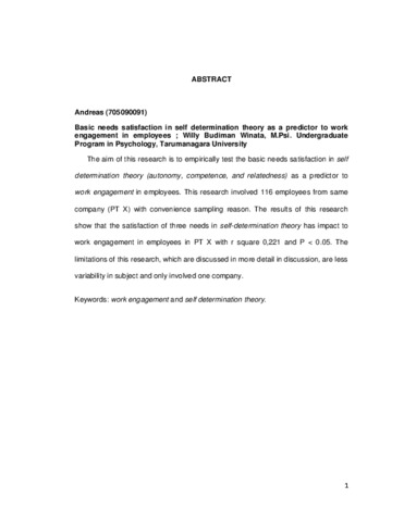 The aim of this research is to empirically test the basic needs satisfaction in self determination theory (autonomy, competence, and relatedness) as a predictor to work engagement in employees. This research involved 116 employees from same company (PT X) with convenience sampling reason. The results of this research show that the satisfaction of three needs in self-determination theory has impact to work engagement in employees in PT X with r square 0,221 and P < 0.05. The limitations of this research, which are discussed in more detail in discussion, are less variability in subject and only involved one company.