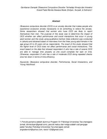 Obsessive compulsive disorder (OCD) is an anxiety disorder that makes individuals who experience it feel excessive anxiety and must do something to eliminate these anxieties. Several studies have been conducted explaining that women who experience OCD tend to report more of the disorder they experience than men. This study uses qualitative research methods and aims to determine the impact of OCD that can affect the performance and social interactions that occur in young adult women. Data retrieval was carried out in Jakarta and obtained based on interviews conducted with three subjects of young adult women aged 22-23 years. The results of this study indicate that the more severe the level of OCD does not affect performance and social interaction for individuals who experience it. This is based on the data that subject A, which has severe OCD is able to manage time well so that it can complete the task on time. On the other hand, in subject D, who had moderate OCD, repeated checks were hampered in terms of time efficiency.