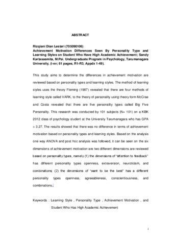 Lestari, Riqqian Dian (2014) Perbedaan Motivasi Berprestasi Ditinjau Berdasarkan Tipe Kepribadian Dan Gaya Belajar Pada Mahasiswa Yang Mempunyai Prestasi Akademik Tinggi. Skripsi thesis, Universitas Tarumanagara.