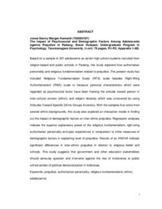 Based on a sample of 307 adolescents as senior high school students recruited from religion-based and public schools in Padang, this study explored how authoritarian personality and religious fundamentalism related to prejudice. The present study has included Religious Fundamentalism Scale (RFS) scale besides Right-Wing Authoritarianism (RWA) scale to measure personal characteristics which were regarded as psychosocial factor have been framing the attitude toward person in inter-cultural context (ethnic) and religion diversity which was uncovered by using Attitudes Toward Specific Ethnic Groups Inventory. With the samples that come from several ethnic backgrounds, this study also explored an interaction model in finding out the impact of demographic factors on inter-ethnic prejudice. Regression analyses indicate the superior explanatory power of the religious fundamentalism, right-wing authoritarian personality and past experiences in comparison to other measures of demographic factors in explaining level of prejudice. Results of an ANOVA indicate significant differences in inter-ethnic prejudice in relation to religious belief and schools. This study suggests that government and other education stakeholders should seriously question and intervene against the rise of intolerance at public school amidst of political democratization in Indonesia.