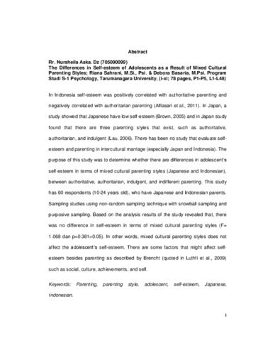 Dzumalin, RR. Nursheila Aska (2014) Perbedan Self-Esteem Remaja Ditinjau Dari Pola Asuh Orangtua Yang Menikah Beda Budaya. Skripsi thesis, Universitas Tarumanagara.