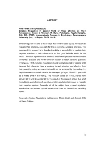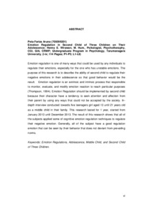 Emotion regulation is one of many ways that could be used by any individuals to regulate their emotions, especially for the one who has unstable emotions. The purpose of this research is to describe the ability of second child to regulate their negative emotions in their adolescence so that good behavior would be the result. Emotion regulation is an extrinsic and intrinsic process that responsible to monitor, evaluate, and modify emotion reaction to reach particular purposes (Thompson, 1994). Emotion Regulation should be implemented by second child because their character have a tendency to seek attention and affection from their parent by using any ways that could not be accepted by the society. In-depth interview conducted towards five teenagers girl aged 13 until 21 years old as a middle child in their family. This research lasted for 1 year, started from January 2013 until December 2013. The result of this research shows that all of the subjects applied some of cognitive emotion regulation techniques to regulate their negative emotion. Generally, all of the subject have a good regulation emotion that can be seen by their behavior that does not deviant from prevailing norms.