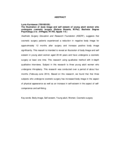 The Aesthetic Surgery and Research Foundation (ASERF), presents cosmetic surgery patients. This research is to reveal body image and self-esteem in young adult women aged 20-40 years and have had cosmetic surgery at least once. This study uses qualitative methods through in-depth interviews. This subject involved three young adult women who had undergone rhinoplasty. This research was conducted for four months (February-June 2014). Based on this study, the authors found several cosmetic surgeries on self-image on aspects of self and speed.