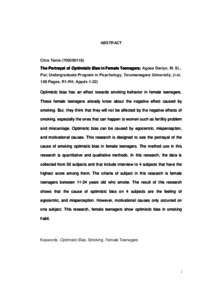 Optimistic bias has an effect towards smoking behavior in female teenagers. These female teenagers already know about the negative effect caused by smoking. But, they think that they will not be affected by the negative effects of smoking, especially the ones that can happen to women such as fertility problem and miscarriage. Optimistic bias can be caused by egocentric, misperception, and motivational causes. This research is designed to see the portrayal of the cause of smoking optimistic bias in female teenagers. The method use in this research is quantitative and qualitative methods. In this research, the data is collected from 50 subjects and that include interview to 4 subjects that have the highest score among them. The criteria of subject in this research is female teenagers between 11-24 years old whose smoke. The result of this research shows that the cause of optimistic bias on 4 subjects are the feeling of egocentric, and misperception. However, motivational causes only occurred on one subject. This research, female teenagers show optimistic bias in smoking habit.