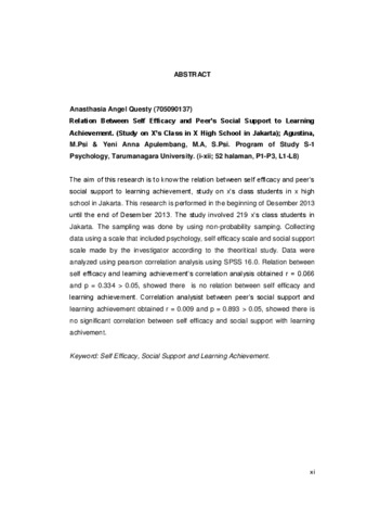 Questy, Anasthasia Angel (2014) Hubungan Antara Self Efficacy Dan Dukungan Sosial Teman Dengan Prestasi Belajar (Studi Pada Siswa Kelas X di SMA X Jakarta). Skripsi thesis, Universitas Tarumanagara.