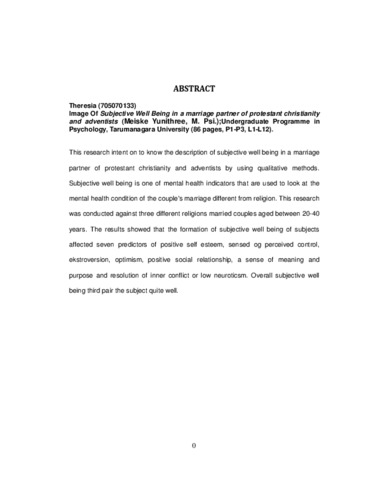 Simanjuntak, Thersia P. (2014) Gambaran Subjective Well Being Pada Pasangan Pernikahan Agama Protestan Dengan Advent. Skripsi thesis, Universitas Tarumanagara.
